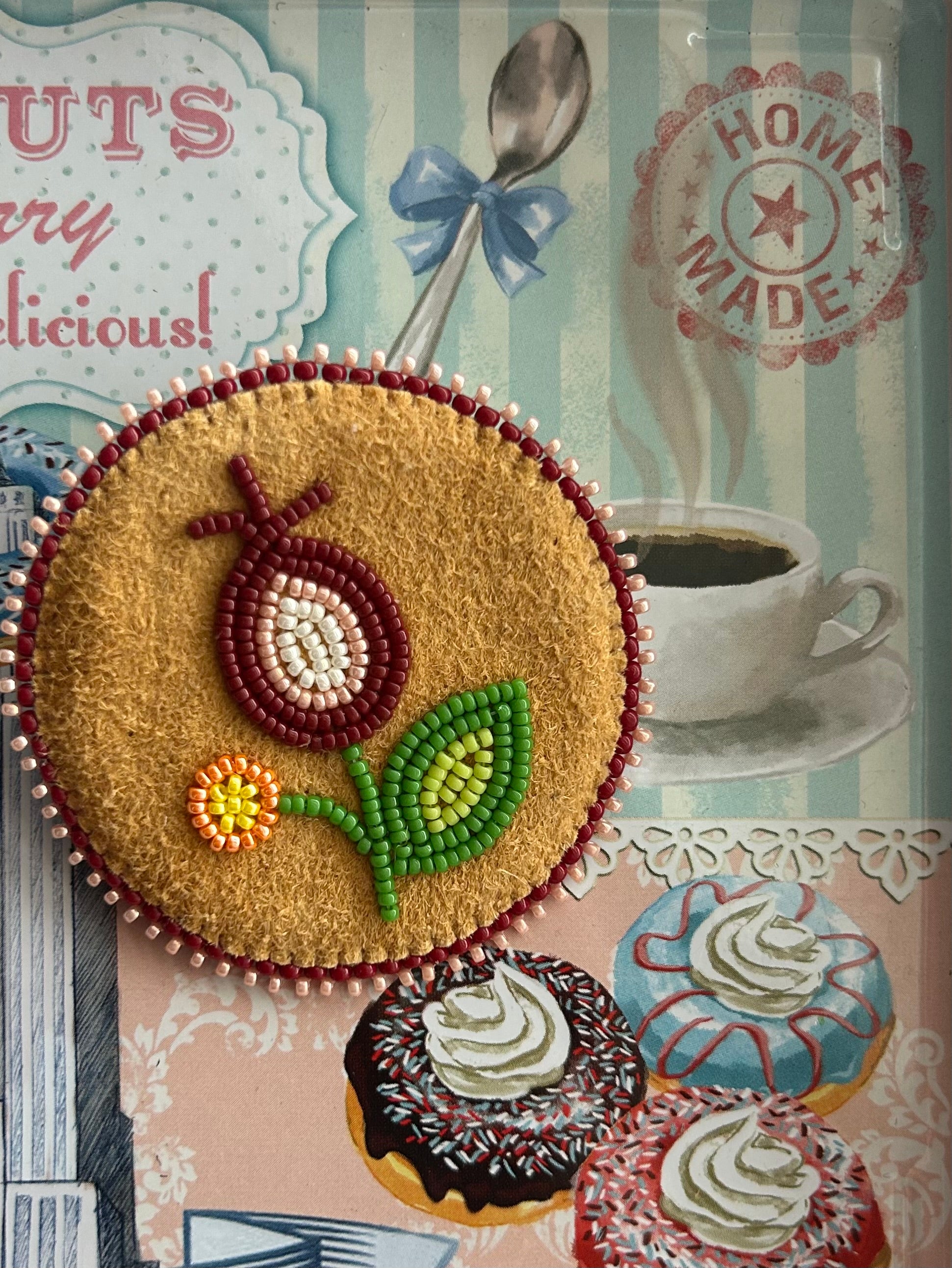Beaded pin. Beadwork on traditionally tanned moose hide with caribou hide backing. Size 15 seed beads, fireline thread. 2 inch diameter.